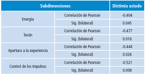 Los resultados también revelan la existencia de correlaciones moderadas (Tabla 4) entre la distimia estado y las subdimensiones energía (r=0.404), tesón (r=0.477) y apertura a la experiencia (r=0.44). Por su parte, en la subdimensión control de impulsos se encontró una correlación moderada con distimia estado (r=-0.521).