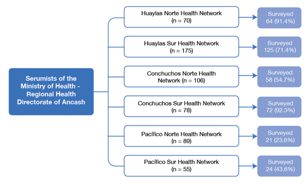 DIRESA-Ancash permission was requested to carry out the study and, with their support, the SERUMS coordinators of each health network in Ancash were trained to apply the surveys and respond the questions raised by serumists. The telephone number of the principal investigator was provided in all the surveys so that serum specialists could contact him in case of doubt.