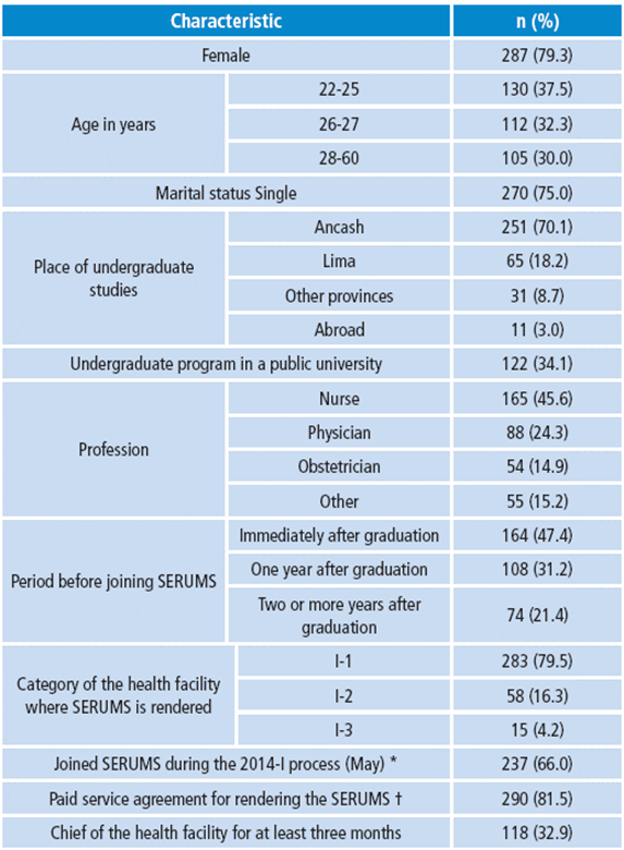 364 surveys were applied to professionals who rendered SERUMS at MINSA facilities in Ancash in April 2015. 79.3% were female, the mean age was 27.4±5.0, 75.0% were single, 70.1% studied an undergraduate program in a university of Ancash, 45.6% were nurses, 24.3% were physicians, 47.4% entered the SERUMS just after graduating, 79.5% were rendering SERUMS in an I-1 health facility, and 81.5% were rendering SERUMS and being remunerated (Table 1).