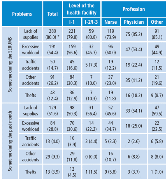 Regarding problems with SERUMS, the survey inquired about experiencing the following during the past month or at some point of their SERUMS: perception of lack of supplies that has prevented the basic management of a patient, some traffic accidents while working or traveling to the health facility, some other accidents (blows, burns, falls, etc.) while working that has caused incapacity for at least a few hours, or some theft while working.
