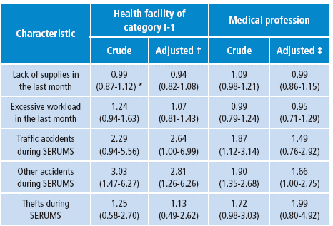The regression models evaluated the association between five outcomes of interest (excessive workload in last month, lack of supplies in last month, traffic accident during SERUMS, another type of accident during SERUMS, robbery during SERUMS), and two variables of interest (being a physician and rendering SERUMS in a category I-1 health facility).