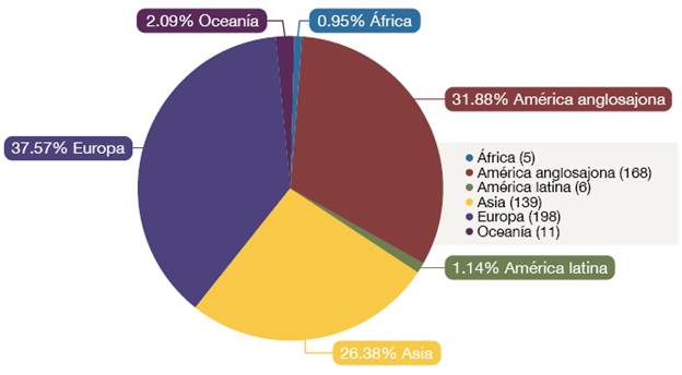 Se encontró que el 30% (n=158) de los casos se reportaron en EE. UU., seguido por Japón (13% n=67), Alemania (6% n=30) y Taiwán (5% n=26). El continente donde más casos se reportaron fue Europa (37.57% n=198), seguido por América (33.02% n=174) y Asia (26.38% n=139). En Latinoamérica se han descrito seis casos (1.14%) (Figura 1).