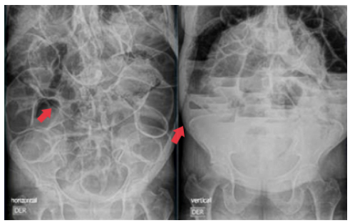 Figura 3: Radiografía de abdomen simple en decúbito supino y bipedestación. - presencia de aire intraluminal y extraluminal como signo de neumoperitoneo.