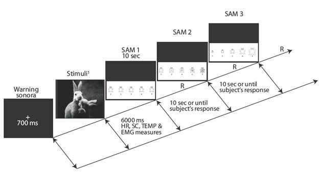 Figure 1: Stimuli sequential probe, psychophysiological measure, and cognitive SAM assignment. International Affective Picture System 31 stimuli numbers: pleasant, 32. Source: Own elaboration based on the data obtained in the study.