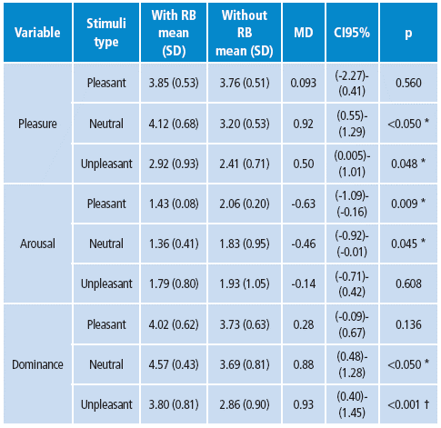 Both groups showed a close emotional valence assessment in relation to the observed stimuli, as well as in the pleasure and domain scales for pleasant stimuli. However, the arousal scale presented significant differences; the control group reported higher levels of arousal compared to the RB group. The control group showed lower pleasure and dominance assessment to unpleasant stimuli compared to RB, while no differences were found in the arousal scale (Table 3).