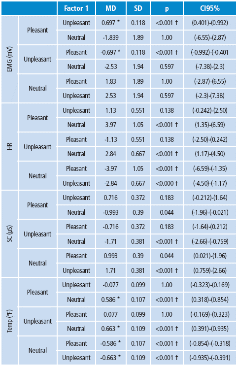 The mean comparison of EKG showed significantly lower values in both groups (mean=84.27, t=60.77, p<0.05) for unpleasant stimuli compared to neutral (media=87.03, t=70.64, p<0.05) and pleasant (mean=88.09, t=68.87, p<0.05) stimuli (Table 2).