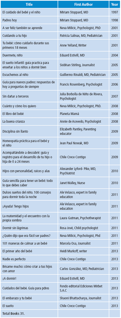 Publications issued in the past two decades, available for purchase and/or reference in Chile. 63 publications, including parenting advice books and 32 web sites, were identified.