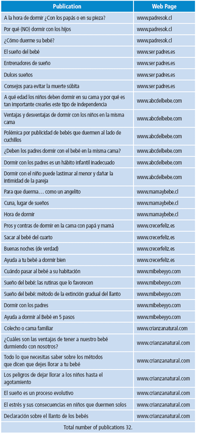 Web pages aimed at parents were selected based on the key words "pages for parents", "advice for parents", and "upbringing". Once the web pages were found, the selection was done considering the following criteria: the country of origin of the web page had to be a Spanish speaking country, containing publications on nursing infants to sleep, published or created between 1994 and 2014 in a journal with a printed edition. A 3-month search period was established (April to June of 2014), identifying eighteen web pages; 10 web pages were selected after complying with all criteria established.