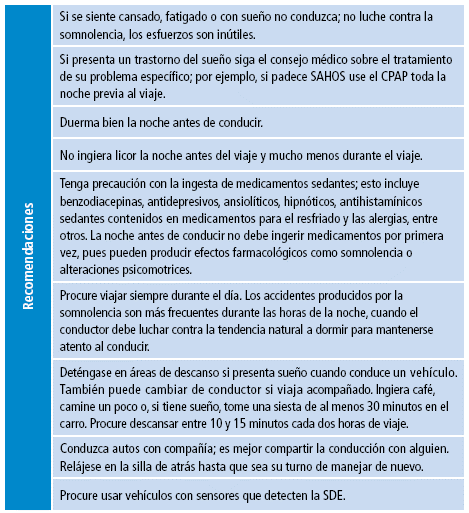Tabla 1: Recomendaciones para la prevención de accidentes de tránsito en personas con somnolencia diurna excesiva.