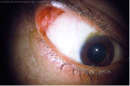 En la Figura 2 también es evidente una inflamación inespecífica, la cual, histológicamente, se compone por epitelio hiperplásico de la conjuntiva asociado a núcleo fibrovascular central 10.