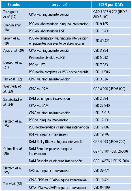 Tabla 1: Estudios que evalúan el costo por años de vida ajustados por calidad para el diagnóstico y tratamiento del síndrome de apnea-hipopnea obstructiva del sueño.