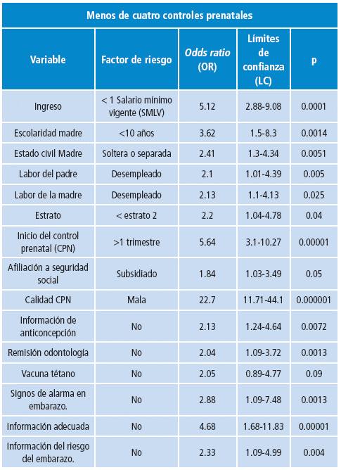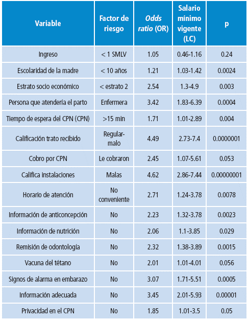 Se encontró, como posible hipótesis de factores de riesgo asociados con significancia estadística, tener menos de cuatro controles prenatales. También se obtuvieron las variables de la Tabla 1 y se destacaron la percepción de la calidad del CPN con OR 22.7, los límites de confianza (LC) de 11.71 a 44.1, el inicio del CPN después del primer trimestre con OR 5.64 LC (3.1-10.27), el nivel de ingreso menor de un salario mínimo vigente (SMLV) (220 dólares por mes) OR 5.12 LC (2.88-9.08), recibir información no adecuada o confusa en el CPN OR 4.68 LC (1.68-11.63), la baja escolaridad de la madre (menor a 10 años de escuela) OR 3.62 LC (1.5-8.3), no ser informada de los signos de alarma en el embarazo en el CPN con OR 2.88 LC (1.09-7.48), ser soltera o separada OR 2.41 LC (1.3-3.34), no ser informada de la clasificación de riesgo de su embarazo OR 2.33 LC (1.09-4.99), no recibir información sobre anticoncepción en el CPN OR 2.13 LC (1.32-3.78) y ser madre desempleada o que trabaja en el hogar OR 2.13 LC (1.14.13).