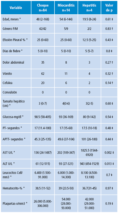Los días de fiebre al ingreso fueron iguales en todos los pacientes y tuvieron una media de 5 días, no hubo diferencia de género en miocarditis, choque o hepatitis; sin embargo, la miocarditis tuvo tendencia a ser más frecuente en varones (9 de 14) y en niños con mayor edad que aquellos con hepatitis: 54 meses en quienes presentaron miocarditis versus 19 meses en quienes presentaron hepatitis (p=0.021, Mann-Whitney test). El vómito fue la mayor manifestación gastrointestinal en todos los grupos, no obstante se encontró hepatomegalia de forma general. Aunque no fue significativo, llamó la atención la presencia de menor derrame pleural en pacientes con diagnóstico de hepatitis (Tabla 1).