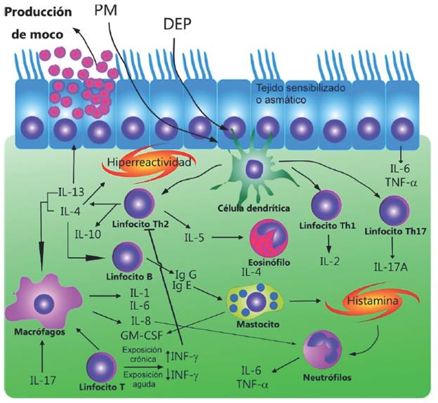 Por otro lado, en un modelo de sensibilización en ratas, la inhalación de DEP provenientes de Detroit activó neutrófilos y eosinófilos y produjo metaplasia mucoide 77. En otros modelos de sensibilización en ratones y ratas, la exposición aguda disminuye de forma significativa el INF-y 78, lo cual estimula el proceso de sensibilización incrementando la respuesta Th17 79 y Th2. En contraste, la exposición crónica eleva la respuesta Th1 por incremento del INF-y 37. La respuesta Th2 promueve la activación de linfocitos B para una posterior producción de anticuerpos específicos IgG o IgE 31.