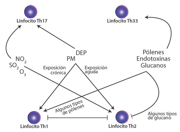 Se encontró que la respuesta de tipo Th2, la cual favorece el proceso de sensibilización, es activada por exposición a ozono, dióxidos de nitrógeno, azufre, partículas (exposición aguda) y algunos tipos de pólenes y glucanos. En contraste, la respuesta Th1 es estimulada por la exposición crónica a partículas y algunos tipos de pólenes y glucanos. Ambas respuestas son excluyentes; es decir, el incremento en la respuesta Th1 podría producir un "efecto protector" en relación con la respuesta de tipo alérgica Th2.