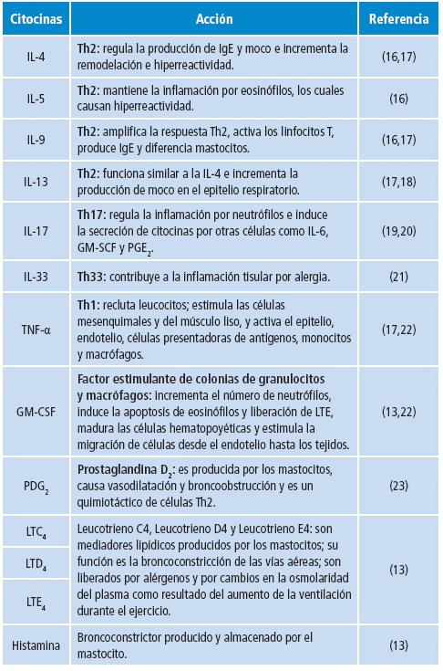 El asma es una enfermedad heterogénea que produce una inflamación crónica en los pulmones y se define por síntomas respiratorios como tos, disnea y opresión torácica que varían en intensidad y con el tiempo. El asma también ocasiona que la variable espiratoria del flujo aéreo se limite 11 y se presente hiperreactividad bronquial y broncoobstrucción reversible con o sin bronco dilatadores 12. En esta inflamación crónica participan varios tipos celulares como los neutrófilos 13, eosinófilos 12, mastocitos, basófilos, linfocitos B y T 14 y células dendríticas 15. Este conjunto celular es capaz de sintetizar gran cantidad de mediadores específicos para las respuestas Th2 y Th17, que pueden producir diferentes cambios en la vía aérea (Tabla 1) y, en algunos casos, aumentar por la exposición a contaminantes ambientales.