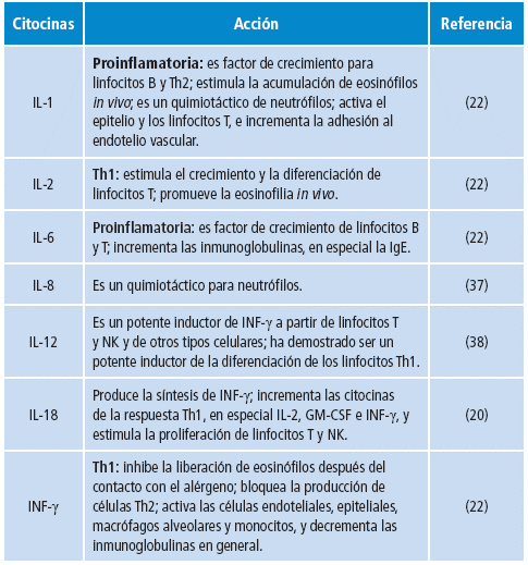 En personas asmáticas, el polen eleva la producción de IgG (94) y activa la respuesta Th2, principalmente por IL-4 95, IL-5, IL-6, IL-9, IL-10 96 e IL-13. En algunos casos inhibe la producción de INF-y 97, aunque el polen del abedul incrementa de forma significativa la respuesta Th1 95. En ratones sensibilizados al polen del ciprés de Arizona (Cupressus arizonica) incrementan los eosinófilos, las células T, las células dendríticas, el dominio Th2 y la IL-33 (Th33) 98. Esta última citocina se asoció de forma consistente con la respuesta tardía en personas alérgicas y retadas por vía intranasal al polen del pasto Phleum pratense99.