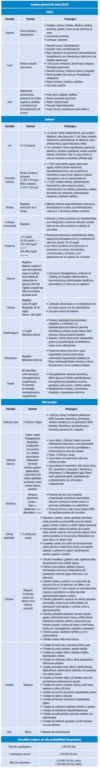 En el EGO, la recolección de una muestra de orina optima es precisa para efectuar un diagnóstico adecuado. Existen tres formas de recolección: micción espontanea, punción suprapúbica (población pediátrica) y cateterización en el momento en que no haya adecuado control de esfínteres. Además, los resultados se deben correlacionar con la detección de un recuento de más de 105 UFC/mL de orina, que en el 80% de los casos corresponde a una bacteriuria significativa. La presencia de cilindros leucocitarios en el sedimento de orina de un paciente con sospecha de ITU debe sugerir afectación del parénquima renal, pero su ausencia no descarta el compromiso. El examen directo o mediante tinción de Gram de una muestra de orina sin centrifugar permite conocer la presencia bacteriuria significativa y si el germen es gramnegativo o grampositivo. Un segundo cultivo positivo para el mismo germen eleva a 95% la probabilidad de bacteriuria significativa. Si la muestra de orina se obtiene por punción suprapúbica, cualquier recuento es indicativo de infección. En pacientes sondados se debe considerar como positivo los recuentos superiores a 103 UFC/mL de orina obtenida por punción del catéter 17