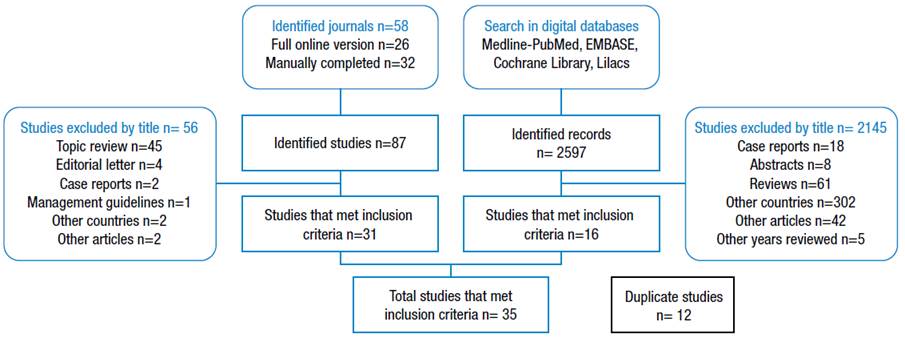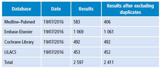Digital search in databases: A digital search was carried out in the Embase, PubMed and Lilacs databases and in the Cochrane Library, using the search structure described in Annex 1. Manual search of bibliographic references: A manual search was made of the references of all the articles identified in the three previous searches, applying inclusion and exclusion criteria.