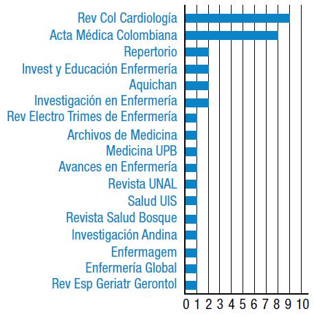 Among journals evaluated, the Revista Colombiana de Cardiología journal had the highest number of publications, followed by Acta Médica Colombiana, which is an expected result. However, a significant number of articles were found in journals edited by universities. At this point, it is worth noting that, several of these journals are indexed in Latin American databases such as LILACS or Redalyc, and even some in international databases, but not all of them are, which makes it difficult to access their articles. This was one of the reasons why the digital search did not identify the total number of articles published, leaving manual search as the only option to identify them. This reinforces the importance of quality improvement processes in the journals, highlighted by various editors, to allow them to access international databases and achieve better scientific positioning. 48-51