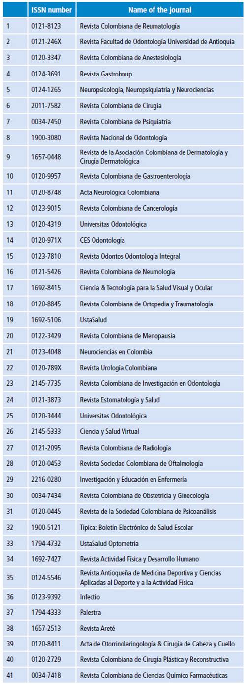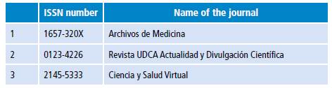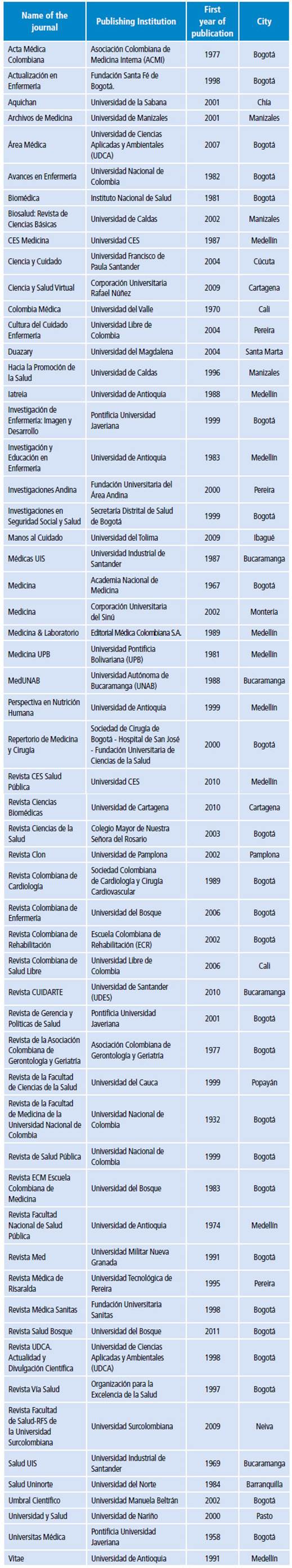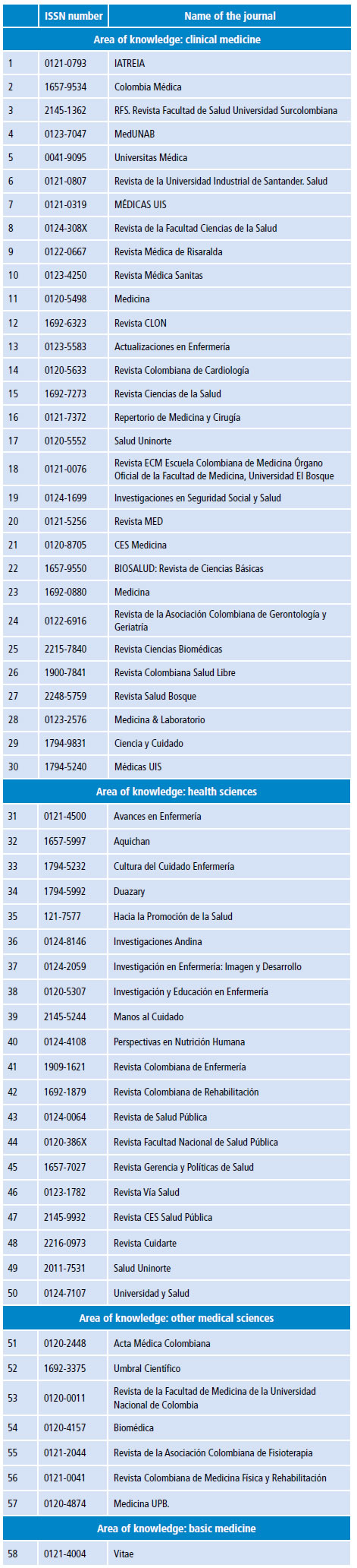Search in domestic scientific journals: A search of journals was carried out on February 23, 2014 in the National Bibliographic Index-Publindex I-2013 update of the official web page of Colciencias. 73 records were obtained (58 in clinical medicine, 25 in health sciences, 14 in other medical sciences and 3 in basic medicine). Of the total journals identified, 58 were selected to conduct the review. The journal identification process is described in Annex 1. Table 1 shows general information of these journals.