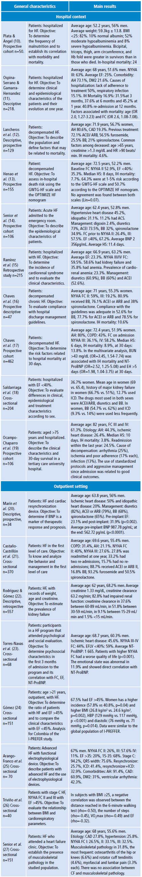 Systematic review. Digital search in Embase, PubMed, LILACS and Scielo, using the MeSH terms: "heart failure", "Colombian", "Colombia", "Latin America", "developing countries". Manual search of 58 journals identified in Publindex. Original research that evaluated adult Colombians with heart failure and published between 1980 and 2015 were included.