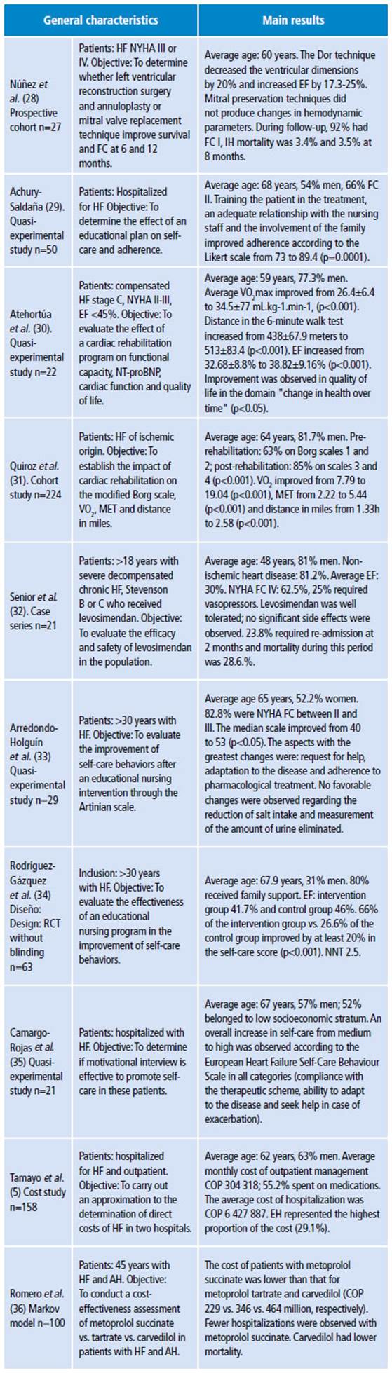 Review of CvLac resumes of the main authors: A search of the resumes of the main authors of the identified articles was made on CvLac to verify the existence of additional articles. Inclusion and exclusion criteria of articles: Original research on patients >18 years of age, diagnosed with acute or chronic heart failure, outpatient or inpatient in Colombia, published in full text, with an observational intervention design or clinical simulation model were included. Case reports, subject reviews, management guidelines and articles published only in summary version were excluded from the analysis.