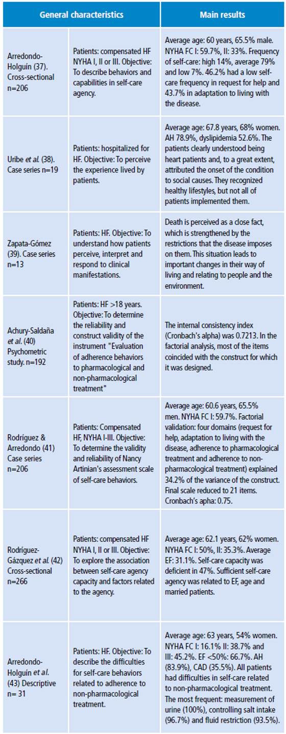 2 684 articles were identified, of which 35 met the inclusion criteria. 30 (85.7%) were published since 2009, 30 (85.7%) were conducted in Bogotá and Medellín, 11 (31.4%) had n>200, 19 (54.2%) were descriptive and 5 (14.2%) quasi-experimental. Moreover, 9 (25.7%) described general populations, 9 (25.7%) addressed the issue of self-care, 3 (8.8%) cardiac rehabilitation, 3 (8.8%) perception of the disease and 3 (8.8%) prognostic factors.