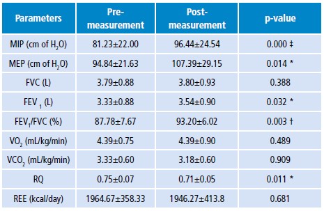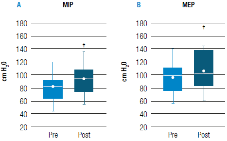 Clinically and statistically significant improvements were found in maximal inspiratory pressure (MIP) (pre: 81.23±22.00/post: 96.44±24.54 cmH2O; p<0.001); maximal expiratory pressure (MEP) (pre: 94.84±21.63/post: 107.39±29.15 cmH2O; p<0.05); pulmonary function FEV1 [(pre: 3.33±0.88/post: 3.54±0.90L) (p<0.05)]; and FEV1/FVC ratio [(pre: 87.78±7.67/post: 93.20±6.02% (p<0.01)].