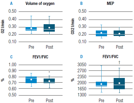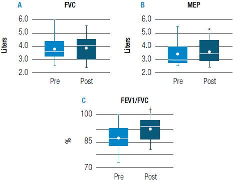 No change in FVC values were observed after the intervention with the Threshold IMT system. In contrast, participants' ability to exhale the greatest amount of volume in the first second (FEV1 increased significantly from 3.33±0.88 to 3.54±0.90 liters (p<0.05); FEV1/FVC ratio went from 87.78±7.67% to 93.20±6.02% (p<0.01). In Figure 2, the dot represents the median, which is very similar in these variables to the mean of the majority, with the exception of pre-intervention FEV1 where the mean is 0.47 liters greater.