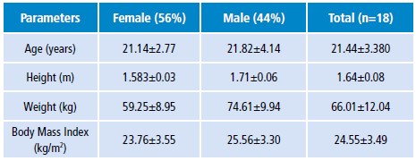 During the pre-intervention phase, 18 subjects were evaluated and, according to IPAQ, were classified as sedentary; of these, 56% were women. The age of the participants ranged between 17 and 32 years; the average body weight was 66.01kg, height 164cm, and BMI 24.55 kg/m2 (Table 1).
