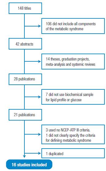 148 titles were identified, of which 120 were discarded since 106 did not include all the components of the MS and 14 were theses, graduation projects, meta-analyses or systemic reviews. Of the 28 pre-selected abstracts, 7 investigations that did not use biochemical tests to define MS were eliminated, as well as 3 that used criteria other than NCEP-ATP III, finally 1 study that did not clearly specify the criteria used to define MS, and 1 duplicated were also excluded. 16 studies met all the criteria for this review. 19-34 Regarding the quality of study reports, all met at least 11 of the 13 criteria assessed (10 met 13, 5 met 12, and 1 met 11). The articles with the lowest scores usually had smaller samples.