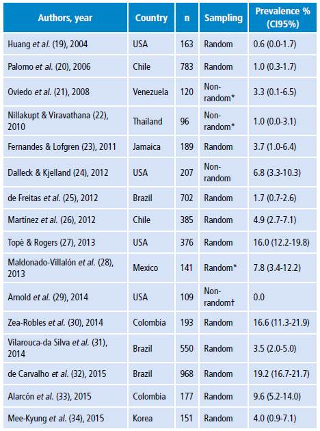 In general, studies conducted in different parts of the world, most of them from Latin America or Brazil, were included. In terms of the major or program to which the students were enrolled, the largest selection was made randomly from all programs (10 studies). The age of the participants ranged approximately between 17 and 26 years, and both men and women participated. The prevalence range of MS ranged from 0% to 19.2%. Table 1 summarizes the information on the findings of the studies in chronological order.