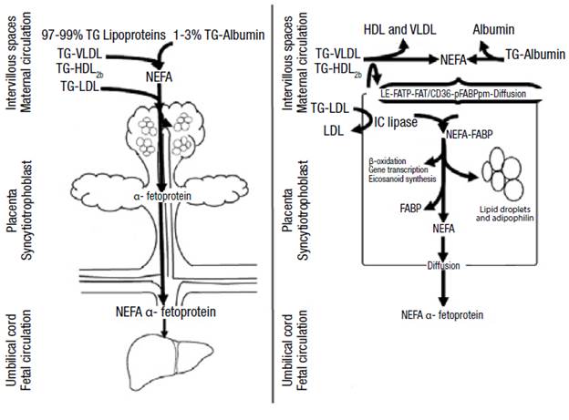 1-3% of maternal fatty acids circulate in non-esterified form and enter the syncytiotrophoblast through diffusion or receptor-mediated endocytosis. 3 Low-density lipoproteins associated with TG (LDL-TG), more abundant in circulation, are hydrolyzed by intracellular lipases and cholesterol ester hydrolases. On the other hand, high density lipoproteins (HDL) and very low density lipoproteins (VLDL) bind to surface receptors and are hydrolysed extracellularly by endothelial lipase. 2,3,16 Transporters such as fatty acid transport protein 1 and 4 (FATP-1 and FATP-4), fatty acids translocase (FAT/ CD36) and plasma membrane fatty acid-binding protein (FABPpm) make fatty acid uptake a more efficient process. 3,16
