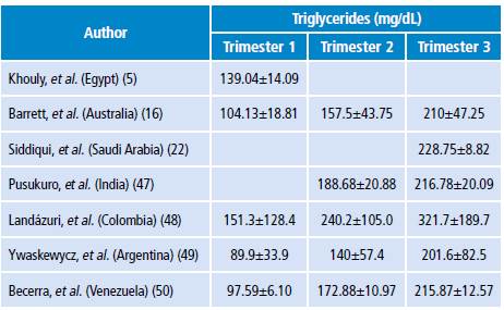 El número limitado y la gran variabilidad de los datos indican la necesidad de realizar más investigaciones que establezcan los rangos de normalidad de los triglicéridos durante los tres trimestres del embarazo y así determinar riesgos e intervenciones eficaces antes de la gestación y reducir la morbimortalidad materno-infantil.