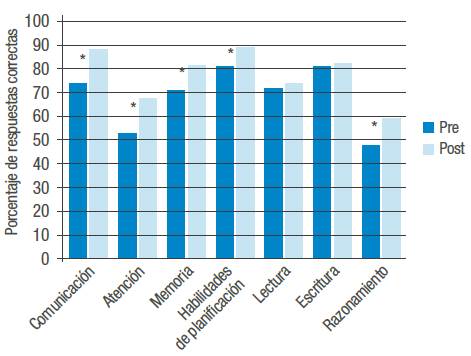 La Figura 1 describe la comparación de los resultados de los participantes en cuanto a las habilidades lingüísticas y cognitivas evaluadas mediante la prueba de los rangos con signo de Wilcoxon. Se encuentran diferencias estadísticamente significativas en las habilidades de comunicación, atención, memoria, planificación y razonamiento con un cambio positivo. En lectura y escritura no se observan diferencias estadísticamente significativas.