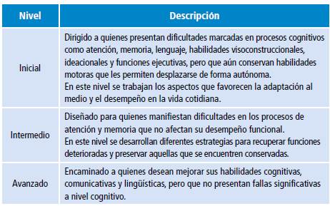 Los pacientes con enfermedad de Alzheimer y sus cuidadores han sido una de las poblaciones para las que más se han diseñado programas de estimulación cognitiva y del lenguaje. A nivel nacional sobresalen los programas Clínica de Memoria de la Fundación Santa Fe de Bogotá e Intellectus del Hospital San Ignacio, mientras que a nivel internacional destacan Memoria en Movimiento36 y Elder Rehab Program37. Este último se desarrolló entre 1996 y 2001 en la Universidad de Arizona y tenía en cuenta aspectos como el estado de ánimo, la condición física y el lenguaje, los cuales eran abordados a través de diferentes actividades de memoria, lenguaje y entrenamiento físico dos veces por semana. Sus resultados han sido reportados en revistas de alto impacto 36-38.
