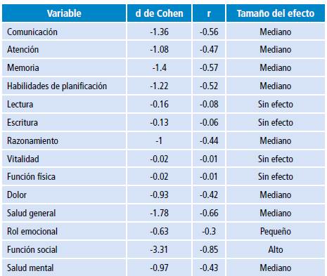 De acuerdo con las pruebas anteriores, como variables cognitivas se consideraron comunicación, atención, memoria, habilidades de planificación, lectura, escritura y razonamiento, mientras que las variables relacionadas con calidad de vida fueron dolor, salud general, salud emocional, función social y salud mental.