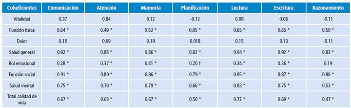 En cuanto a las correlaciones entre las habilidades cognitivas y lingüísticas y las variables de calidad de vida relacionadas con la salud, se encuentra significación estadística en la mayoría de las variables observadas, excepto vitalidad y dolor. Si bien a partir de este análisis no es posible establecer causalidad, es posible establecer relaciones útiles en la planeación de las actividades (Tabla 5).