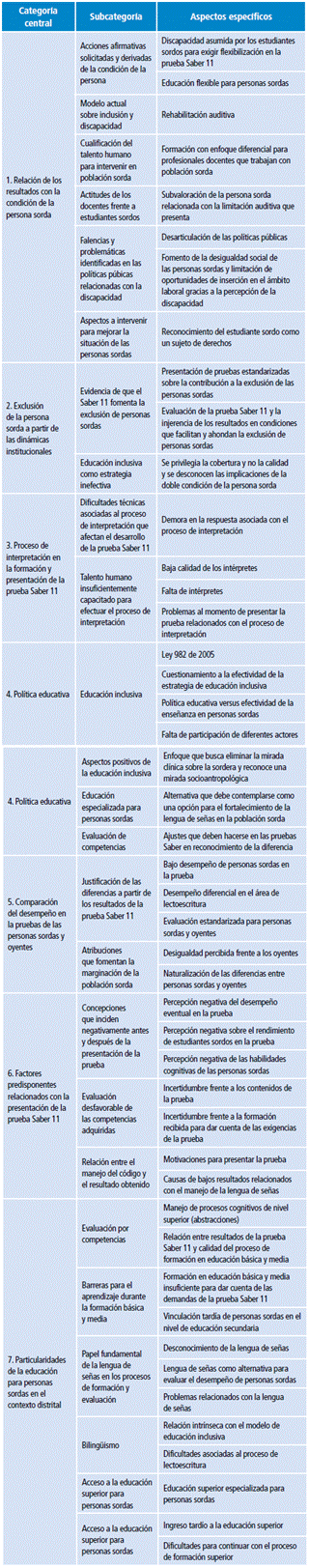 Se estructuraron siete categorías de incidencia relacionadas con la condición de la persona sorda, procesos educativos a nivel distrital, formas de exclusión educativa, factores predisponentes a la presentación de la prueba Saber 11, política educativa, desempeño de personas sordas y oyentes.