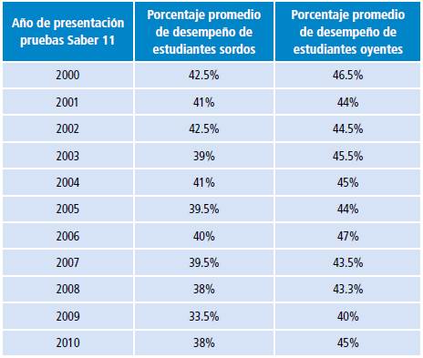 Tabla 3: Resultados Promedio estudiantes sordos y oyentes periodo 2000-2011.