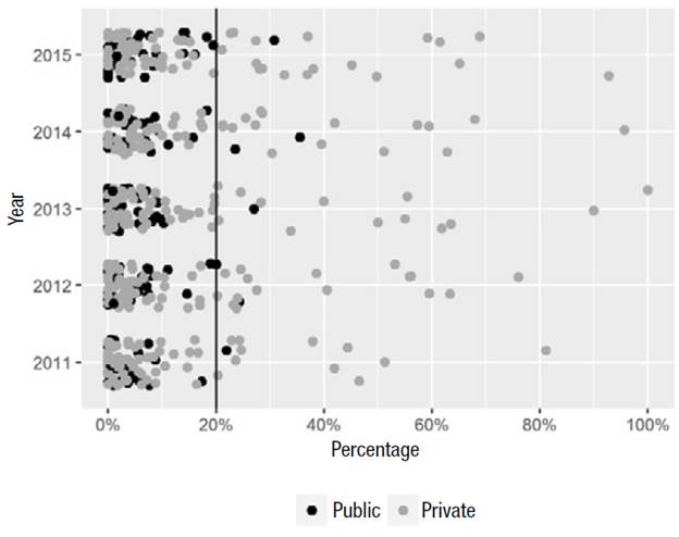 Figure 1 represents with a dot the proportion of medical students classified in B+ and with colors, public institutions (in black) and private institutions (in gray). This graph allows identifying six interesting results: