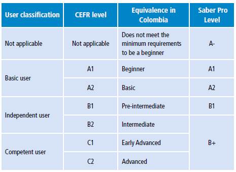 Table 1: Equivalences between the reference levels of the Common European Framework of Reference for Languages, the reference levels of the country and of the classification of the Saber Pro test.