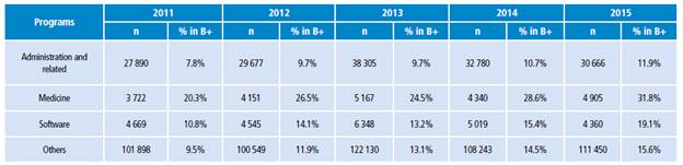 Before analyzing the results per program, it is important to note that once the results have been evaluated by category for Administration and related programs, Software and Medicine, the proportion of medical students classified in B+ was found to be higher than in the other programs (Table 2). In 2011, while Administration and related programs classified 7.8% of their students and software 10.8% in B+, Medicine had 20.3%. Likewise, for the year 2014,10.7% of the students of Administration and related programs, 15.4% of software students and 28.6% of medical students were classified as B+. For 2015, 31.8% of medical students, 11.9% of students of Administration and related programs, and 19.1 % of software students were classified as B+. It should be noted that medical students had a higher number of students classified in B+ during the study period than the other areas; furthermore, this number increased by 40.6% from 2011 to2014andby 11.8% in the past two years.