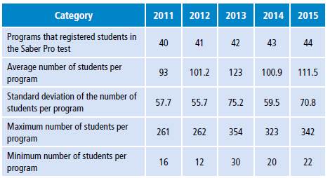 As described in Table 3, the universities that registered their medical students in the Saber Pro test went from 40 in 2011 to 44 in 2015. The average number of students per program increased from 93 in 2011 to 111 in 2015. The past year, the Universidad Metropolitana de Barranquilla registered 342 medical students in the Saber Pro test, while the Universidad de Nariño registered 22 students. The increase, of about 30% in the minimum and maximum number of students per university, partially explains the 20% growth in the average number of medical students per program.