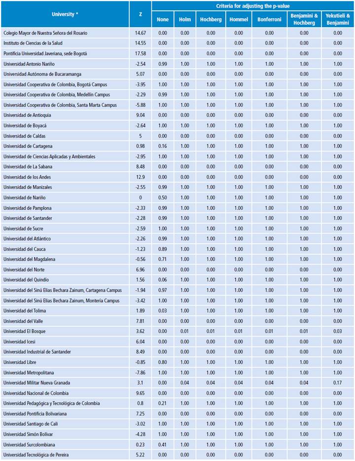 If the fact that multiple comparisons were made is not considered and if p-values were adjusted, two more universities (Universidad Militar Nueva Granada and Universidad del Tolima) would have met the goal in 2014. It is worth noting that although the ρ values for most universities were different in magnitude among the criteria used -Holm 13, Hochberg 14, Hommel 15, Benjamini & Hochberg 16 and Yekutieli & Benjamini 17-, the decision was always directed in the same direction: rejecting the null hypothesis. However, for the Universidad Mlitar Nueva Granada, when the parametric test was used only under the Yekutieli & Benjamini criterion, the null hypothesis was rejected, which did not occur in other cases. Given that under the nonparametric test the null hypothesis was rejected when using any of the criteria, it is concluded that, for this year, the university did not meet the goal.
