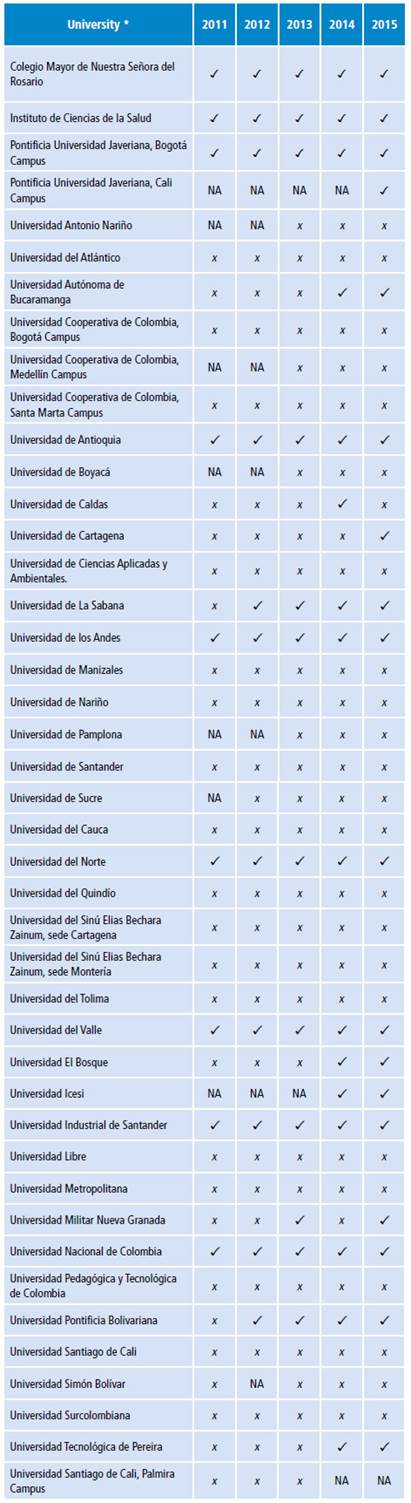 ✓: The university met the goal, which is determined by rejecting the null hypothesis in favor of the alternative with 95% confidence; x: It was not possible to determine if the university met the goal since the null hypothesis could not be rejected in favor of the alternative to include a definition; NA: The university did not register medical students for that year, either because no student classified in B+ existed or had not yet graduated the first class of students of the program. * The universities are listed alphabetically. Source: Own elaboration based on the data obtained in the study.