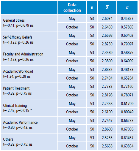 The third predominant factor is "Patient treatment", which is surprising because students do not interact with clinical subjects or patients in the first year. This may reflect the effect of the academic environment on second-semester students, who may be transferring their negative impressions to freshmen. On the other hand, a statistically significant difference was observed in the "Others" dimension between the mean of the data of May and October. This dimension includes extracurricular factors related to personal, socioeconomic and future employment situation, and could be explained, in part, by the uncertainty generated by events such as changing city, which leads us to think of adaptation to these factors by the new students. 24