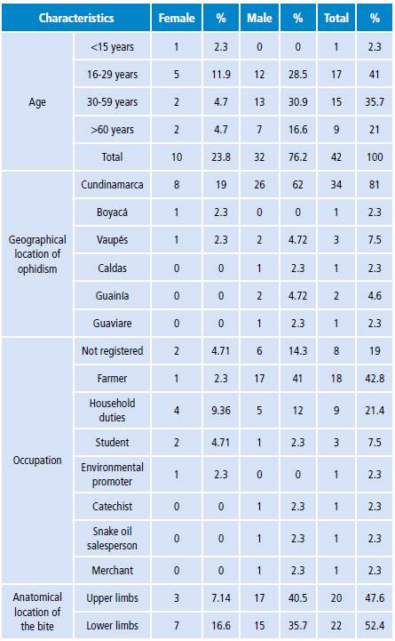 Results reveal a scenario in which diverse medical, sociocultural and economic factors converge and lead to an outcome. Epidemiological data obtained from the population studied are similar to those found by some researchers in Colombia 7 and those recorded in the national report of ophidian accidents. 11