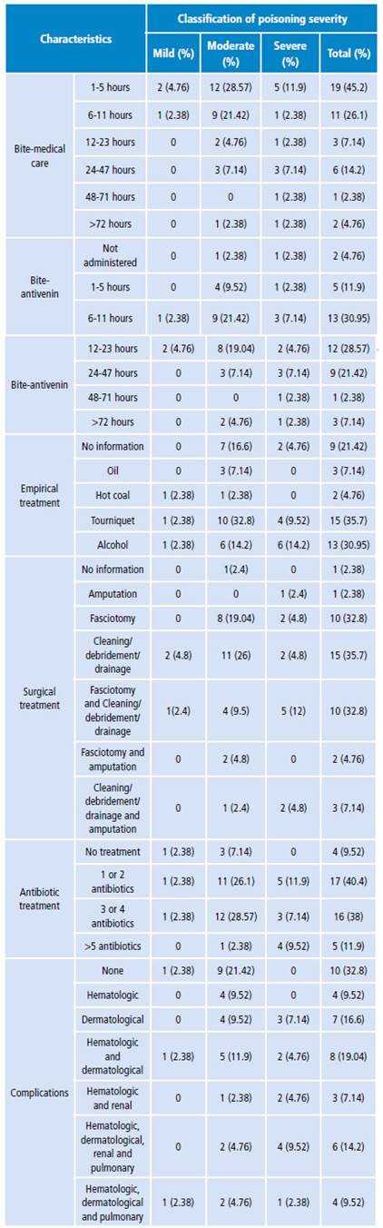 With respect to severity, numerical and (1, 2, 3 and 4) and status records (mild, moderate and severe) were obtained. Taking into account the most used classification, 63.3% of patients were classified in moderate stage, 28% in severe and 7% in mild. The time elapsed from the bite until initiation of medical attention ranged between 1 and 5 hours in 45.2% of the patients, of which 28.5% were in a moderate stage of poisoning.